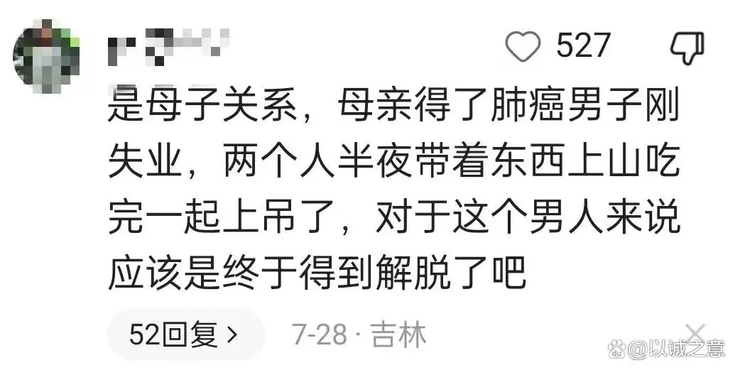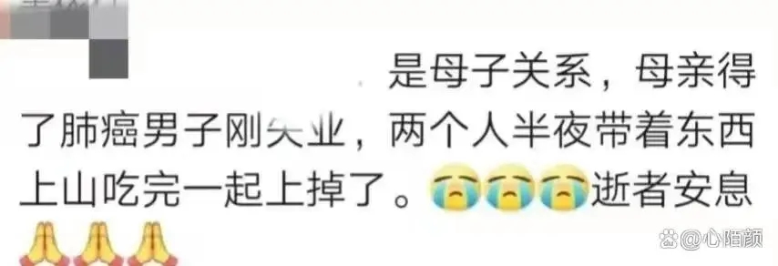 有一位网友透露:“这对母子之间存在着亲子关系,母亲患有肺癌,而儿子刚刚失业。他们在深夜携带着一些东西上山,然后一起选择了上吊。”这个场景实在令人难以想象,母子俩同时选择了上吊?从照片上看,男子似乎有些挣扎,这也让一些网友猜测他可能有些后悔。