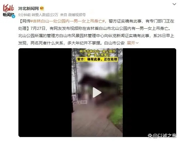 7月27日,有网友发布视频称,在吉林省白山市白山公园内有一男一女上吊身亡。当地警方证实确有此事发生,现在有专门部门正在进行处理。白山公园管理方的白山市风景园林管理中心工作人员也向相关媒体证实确有其事,但发现两名死者的时间是7月26日早晨,至于两名死者是什么关系,多大年纪并不知情。