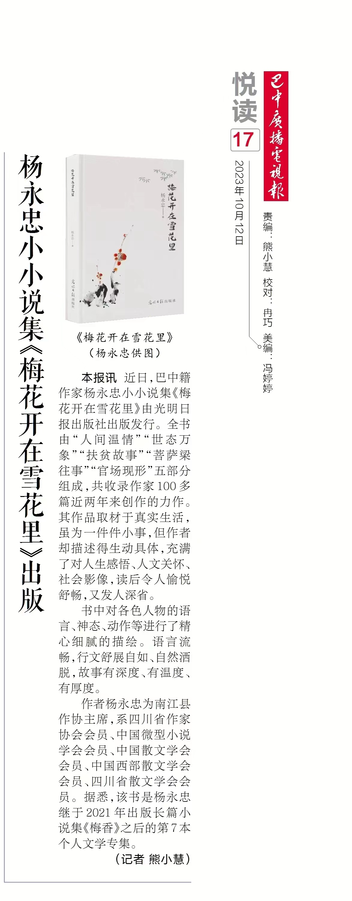 第一次看到这篇文章的时候是巴中广播电视报10月12日的一篇名为(杨永忠小小说集《梅花开在雪花里》正式出版)#用艺术唤醒冬天#
