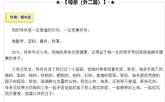 当读到四川南江作家杨永忠老师一篇名为(母亲)的作品后不经意让人想起这样一句话“