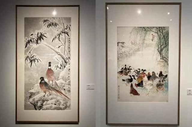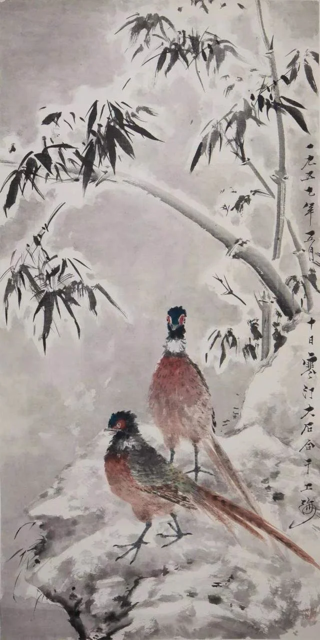 此次展览中特别加入的一个版块,便以三位画家与画院其他同道合作绘制的花鸟画作为展示内容,呈现这一时期海派画家频繁交流的一番盛景。有意思的是,在仅展示的十来件合作画中,画家们并非只为了完成一个“笔会”的仪式,而是仍然注重充满生活情趣和富于变化的笔墨表达。比如同是江寒汀与唐云合作于上世纪50年代的《雪竹双锦》和《六畜兴旺》两件作品,在作品构思和表现技法上呈现出两种截然不同的面貌:《六畜兴旺》描绘的是现代农村养殖业的丰收景象,运用写实的手法,将鸡鸭结对成群,家猪膘肥体壮的场景描绘得生动自然,线条严谨、造型准确,十分贴近生活;而《雪竹双锦》二人则施以爽健老辣的写意笔墨,雉鸡、冬雪、苍竹、怪石,蕴含着勃勃的野趣,表现手法则更接近古意,保持着文人绘画天真烂漫的情致。江寒汀和唐云各骋所长:江氏禽鸟造型各异、昂然生姿,不论细笔还是写意都能排布得当,惟妙惟肖;唐云健笔纵横,含蓄与野逸皆能收放自如,同时又能照顾到作为主景之江氏禽鸟的用笔和布局,这是知己间的默契相通。但两人也没有一味迎合对方,仍然有属于自我个性的笔墨表达,似也要在一方画面中较一技之短长。和而不同,亦为君子之交。